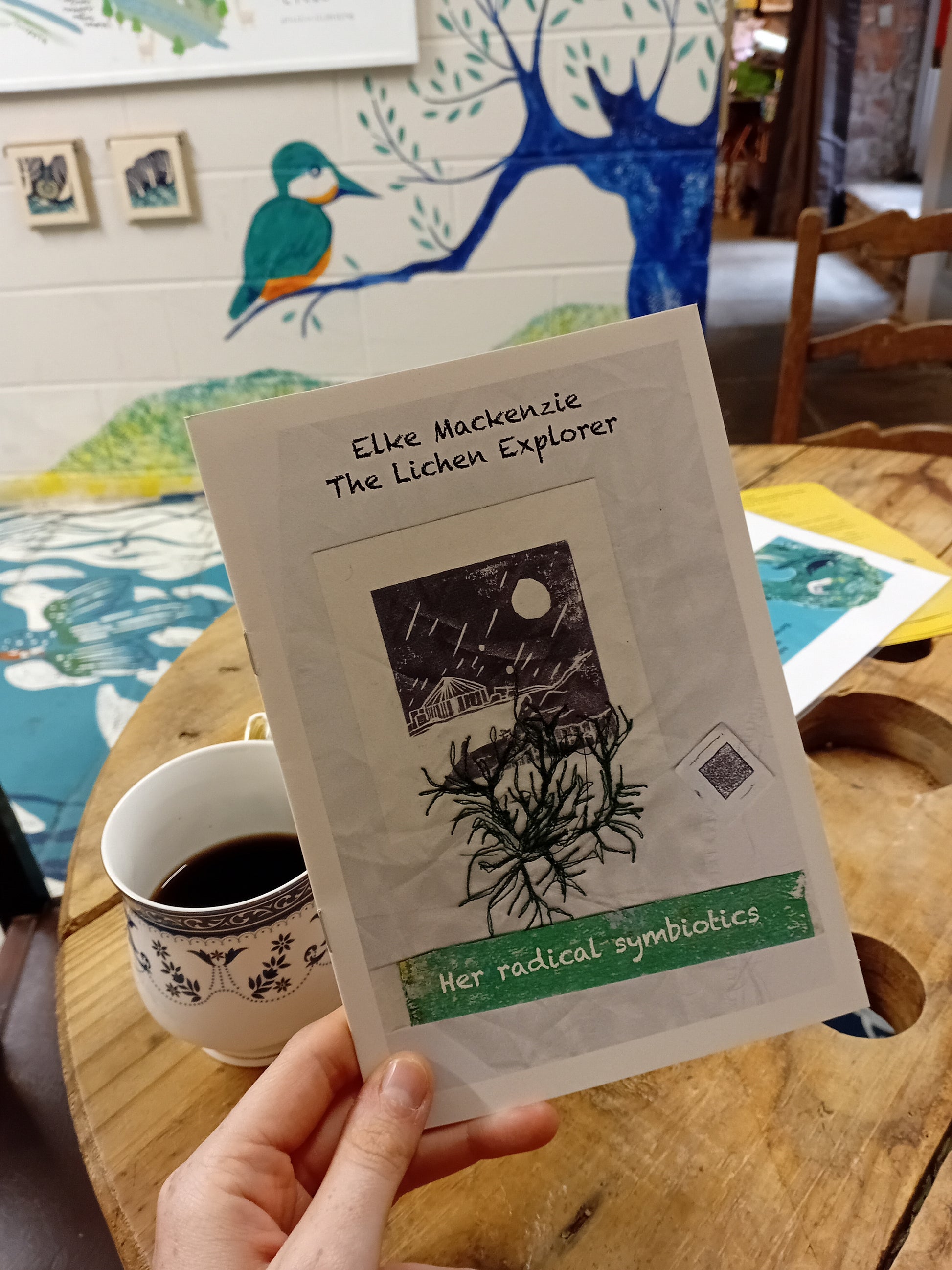 "Her Radical Symbiotics" is an A5 zine about lichenologist and polar explorer Elke Mackenzie. The zine is a printed 8 page booklet printed on recycled paper. The interior and cover artwork was made using embroidery, gel plate printing and lino cut printing.